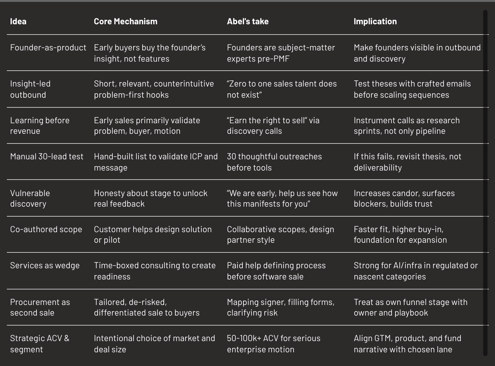 Abel’s central insight: zero-to-one sales is structured learning with a quota, not logo collection.