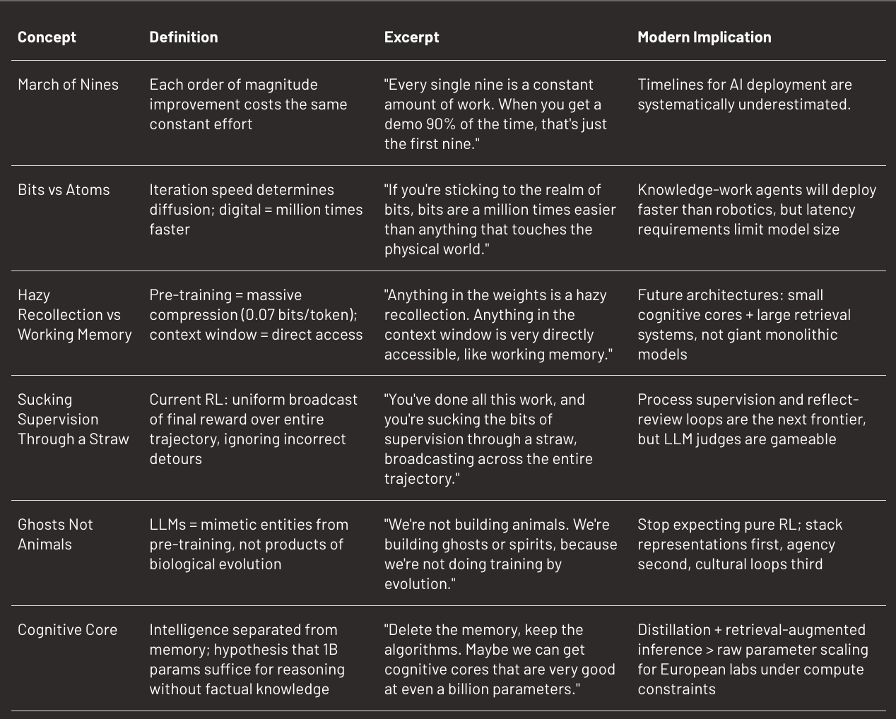 “What I think we have to do going forward is figure out ways to remove some of the knowledge and to keep what I call this cognitive core. It’s this intelligent entity that is stripped from knowledge but contains the algorithms and contains the magic of intelligence and problem-solving and the strategies of it and all this stuff.” — Andrej Karpathy, 2025