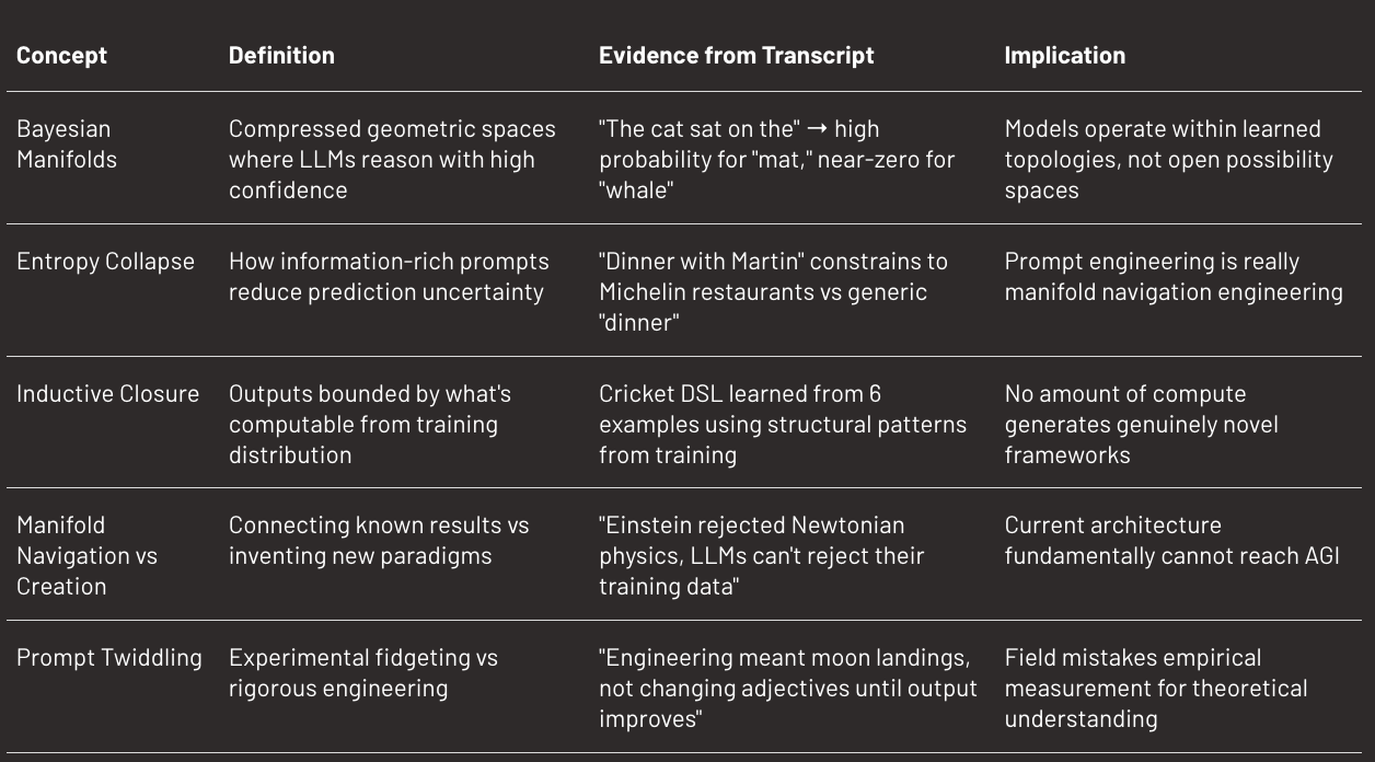 The model isn’t creating new reasoning methods. It’s applying known algorithms to new instances. It’s computing what’s already implicit in its training data, not generating fundamentally novel approaches. Vishal Misra calls this the inductive closure of the training set. LLMs can fill in missing rows of the conceptual matrix where algorithms already exist. They can interpolate between training examples with sophistication. They can connect distant results in surprising sequences. What they cannot do is step outside this learned topology.